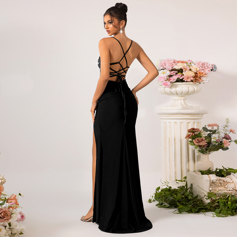Black Sequin V-neck Fishtail Evening Dress