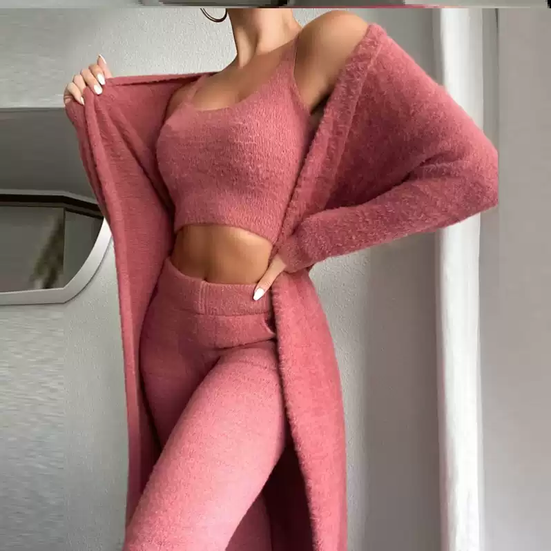 Three-piece set: Complete ladies suit including cardigan, top, and bottom piece